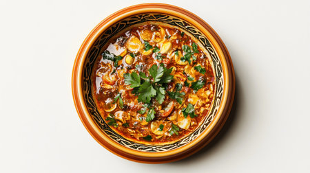 A top-down view of a bowl filled with a rich and appetizing soup, garnished with fresh green herbs.