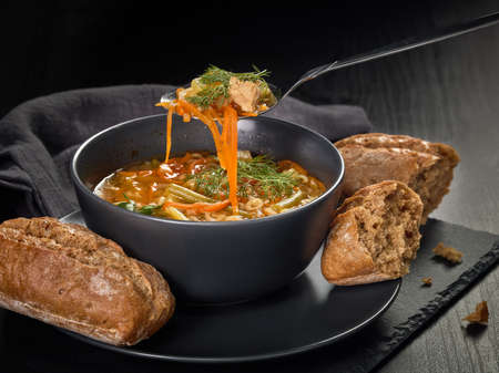 Homemade chicken soup with noodle in the white bowl with spoon, beside brown bread and parsley on the black surface, top view