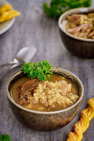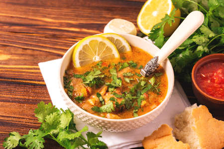 Traditional jewish wedding and holyday Yemenite vegetable beef soup Marak Temani. Yom Kippur. Israeli cuisine