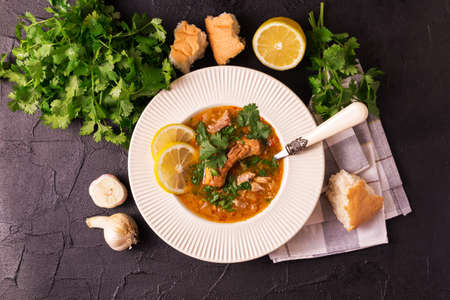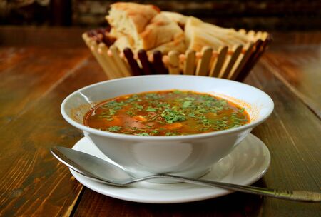 Plate with kharcho soup on a table