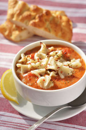 Tomato soup with manti and pide bread Selective focus