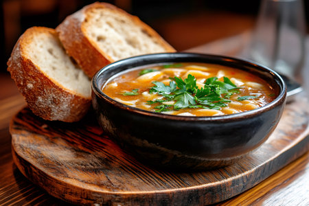 Tomato soup with small pasta and fresh parsley served with bread on wooden board in restaurant