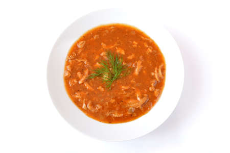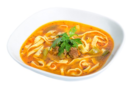 Orange Soup with meat and Pasta isolated on white