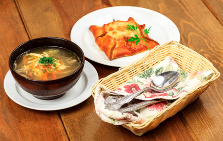 Chicken soup with salad and bread. Russian kitchen.