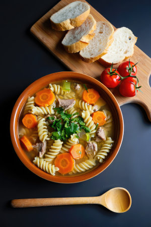 A warm bowl of pasta soup features spiral noodles, carrots, and tender meat, garnished with fresh herbs. Slices of bread and tomatoes accompany the dish on a wooden cutting board.