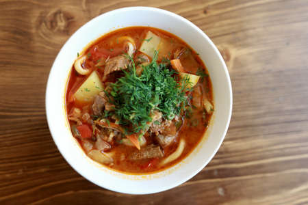 Bowl of lagman soup on wooden table in restaurant