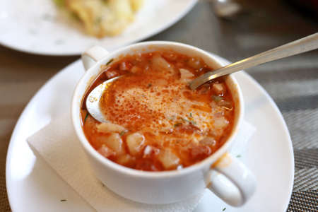 Spicy tripe soup with red paprika.