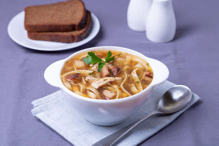 Soup with mushrooms, chicken and noodles in a white plate. Traditional Russian dish. Close-up.