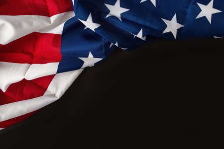 American Flag close up on black background for Memorial Day or 4th of July. flag day. national patriotic holiday. Greeting card or banner for a website or store sale. Layout. top view.