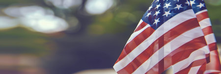 Close up of United of America flag in warm retro style and back light, selective focus, good for USA theme background or 4th of July concept