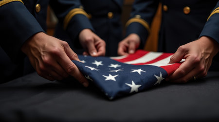 Military officers in uniform are carefully folding the American flag on a table