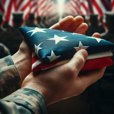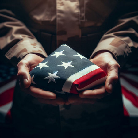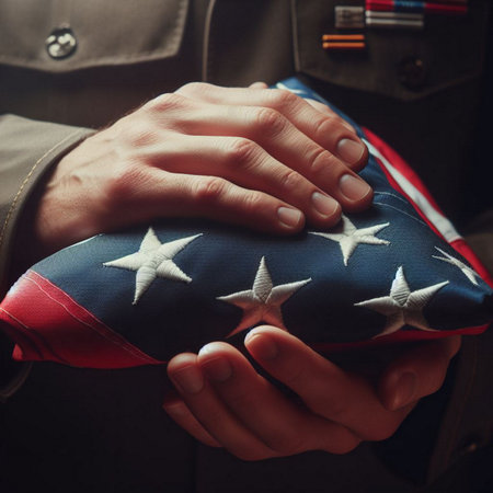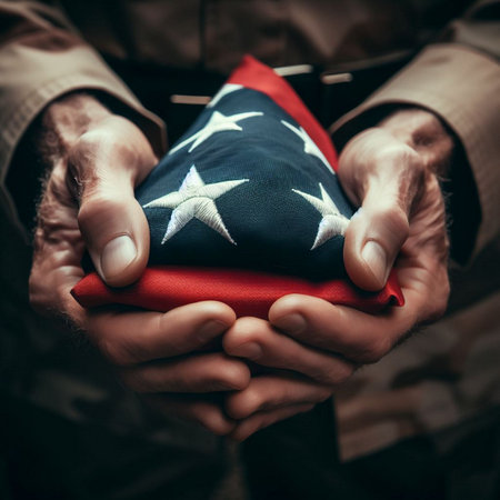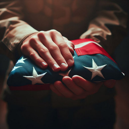 A veteran's hands hold a folded American flag, a symbol of patriotism and sacrifice.