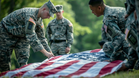 United States - March 29 2022: United States Marine Corps soldiers roll up American flag, USA or US army troops ready for drills or war