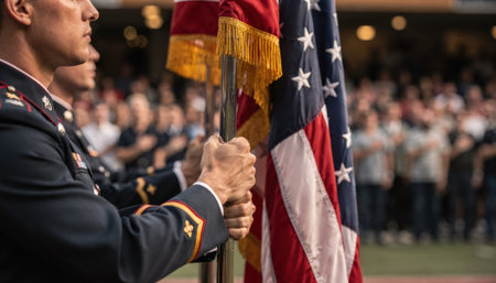 Closeup of flag holders with the national anthem in progress the audience standing quietly behind them in soft blur illustrating solemn respect and tradition.