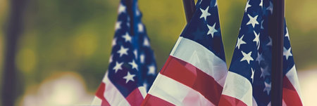 A row of American flags in a shallow depth of field, with a focus on the front flag. The flags are waving gently in the breeze, and the red, white, and blue colors are vibrant.