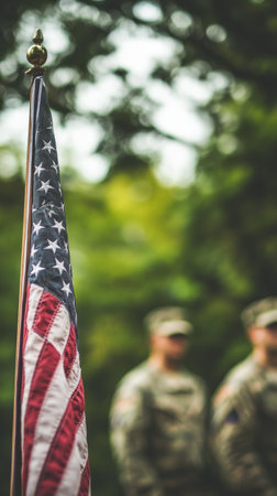 Close-up of the American flag with soldiers in the background during a sunny day. Represents military pride on Veterans Day and Memorial Day.