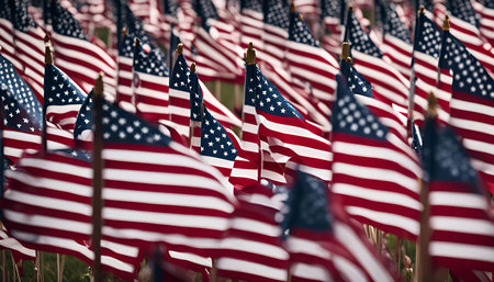 A field of American flags waving in the wind, a powerful symbol of patriotism and national pride