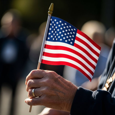Close-up of elderly veteran holding an American flag at a memorial service. Veterans Day observance.