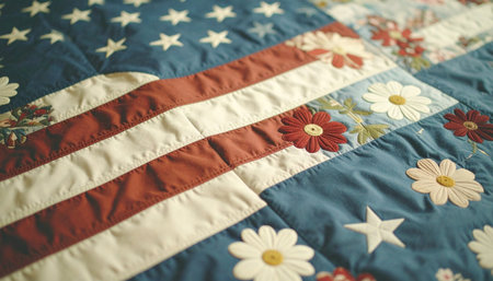 Quilt with American state flowers arranged into American flag pattern, textile detail. 4th of July concept