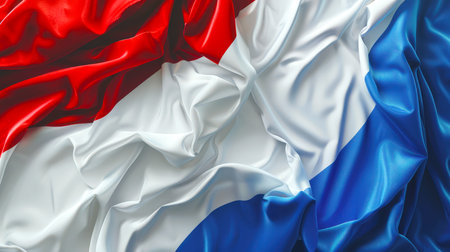 A flag with red, white and blue stripes. The flag of the Netherlands is waving in the wind, close-up, top view. The flag is a symbol of patriotism and pride. Citizenship and tourism. Patriotism and pride