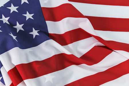 Close up of ruffled American flag. Satin texture curved flag of USA. Memorial Day or 4th of July. Banner, freedom concept