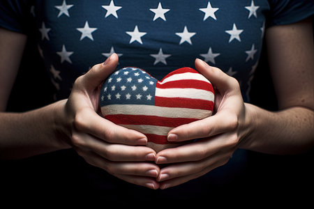 Heart with american flag colors on it in hands. Love and patriotism concept. Ai Generative image