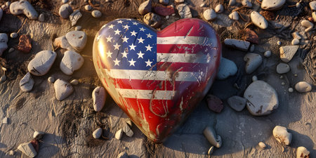 A young girl holds a heart-shaped stone painted in the American flag. This heartwarming image evokes feelings of love, unity, and patriotism in nature.