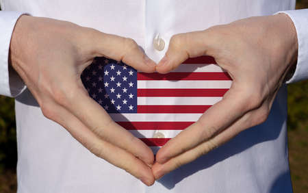 man holidng his hands in heart shaped on white shirt with usa flag colors national holiday concept