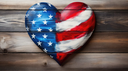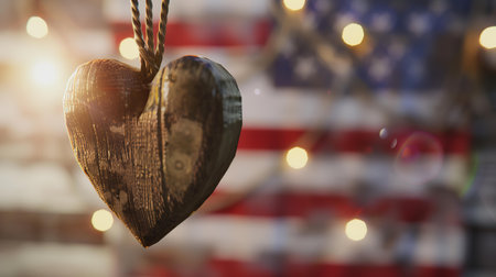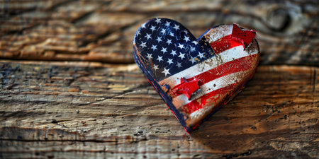 Heart-shaped American flag decoration with a rustic, weathered texture placed on an aged wooden surface, symbolizing patriotism and heritage