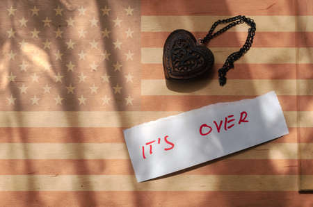 Handwritten note It is Over in a white piece of paper. Wooden amulet in the shape of a heart. USA flag background, shadows. Love, Relationship Concept. Top view