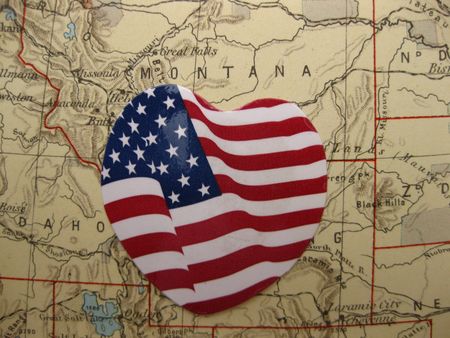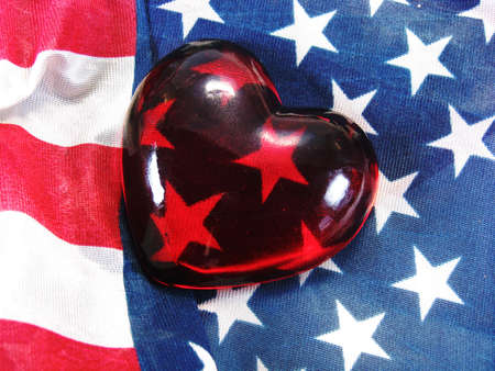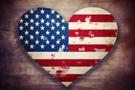 A heart-shaped object featuring the American flag with a slightly aged texture, placed against a neutral white background, symbolizing national pride and heritage.