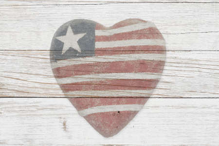 Old heart American flag on weathered whitewash wood with copy space for your United States message