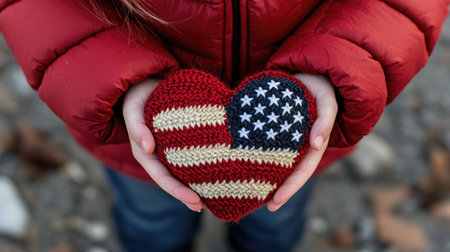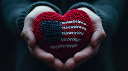 A person holds a knitted heart featuring an American flag design, symbolizing love, patriotism, and connection. The cozy fabric adds warmth and charm.