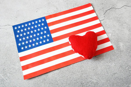 Independence Day USA concept. Memorial Day. Heart shape of red roses with the US flag flat lay top view