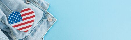 top view of paper cut heart made of american flag on denim stylish jacket on blue background with copy space, panoramic shot