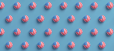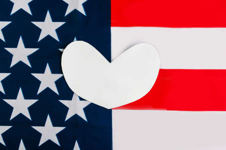 American flags and white heart on blue background. Independence Day concept, 4th of July.