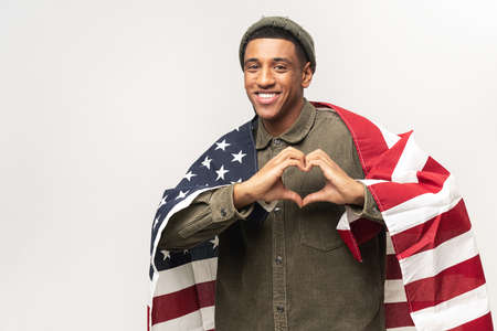 Happy latin man fighter for rights with United States flag showing heart shape with his hands, smiling and cheerful guy protesting against racism, isolated on white wall