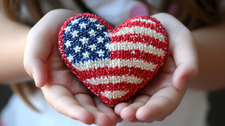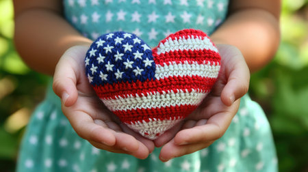 A heart-shaped American flag knitwork being held with care, symbolizing love and national pride