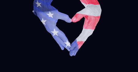 Composition of two hands holding hands decorated with american flag making heart shape on black. patriotism, independence and celebration concept digitally generated image.