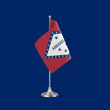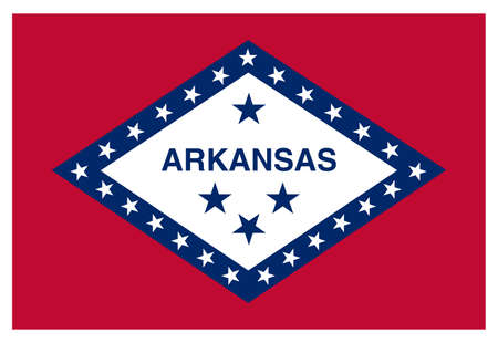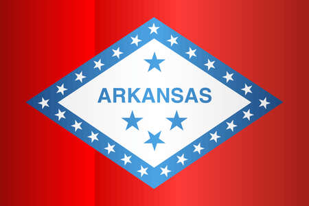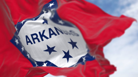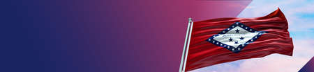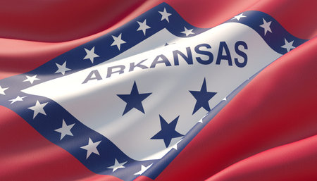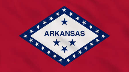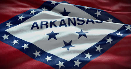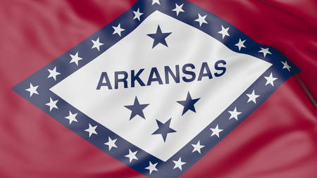Arkansas state flag waving in the wind on a clear day. Red field with blue-bordered white diamond. 29 stars and ARKANSAS in blue. 3d illustration render. Selective focus. Fluttering fabric.