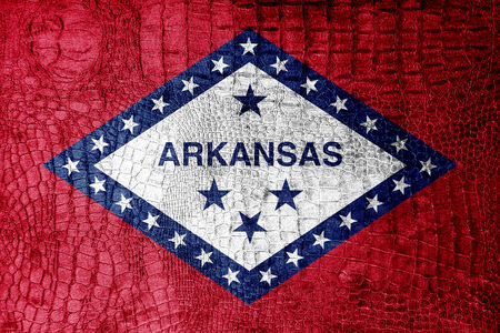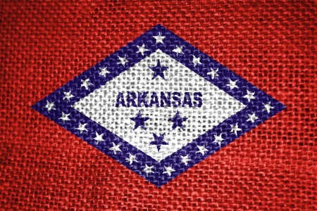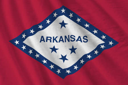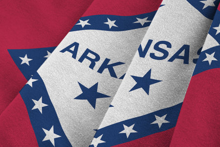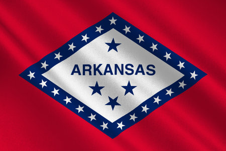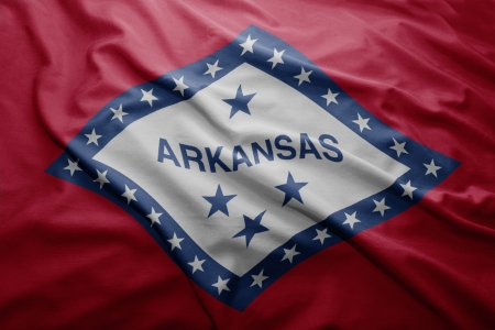 Realistic flag State of Arkansas on the wavy surface of fabric. Perfect for background or texture purposes.