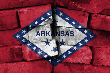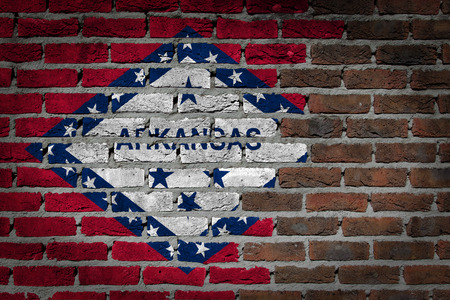 Chalky and grunge american state of arkansas flag painted with color chalk on brick wall