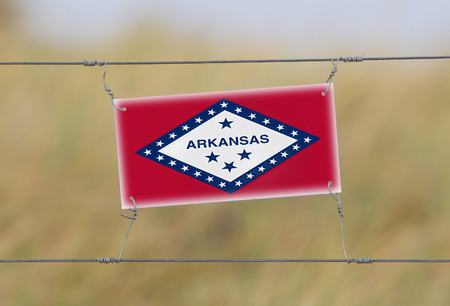 USA Politics News Concept: US State Arkansas Flag Wooden Fence