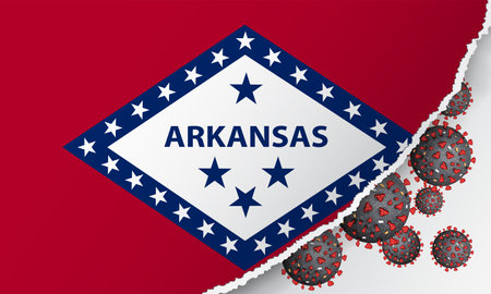 Flag of Arkansas state with outbreak viruses deadly coronavirus COVID-19. Banner with the spread of Coronavirus against background of national flag. USA Lockdown. Concept of quarantine. Stay at home.