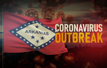 Coronavirus COVID-19 outbreak concept with flag of the states of USA. State of Arkansas flag Pandemic 3D illustration.