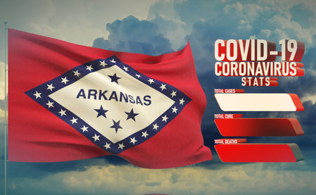 COVID-19 Coronavirus 2019-nCov Statistics Update - table letter typography copy space concept with flag of the states of USA. State of Arkansas flag Pandemic 3D illustration.