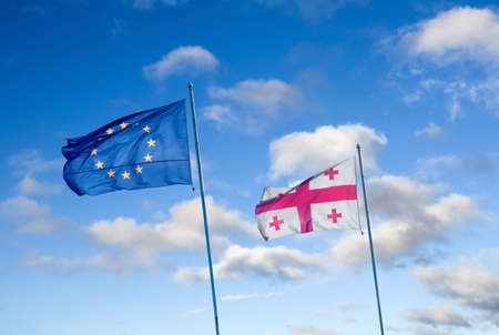 Waving European Union flag and flag of Georgia. Closeup view, 3D illustration.
