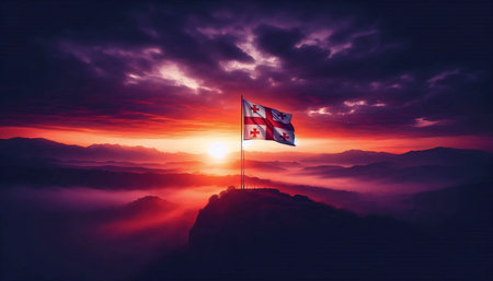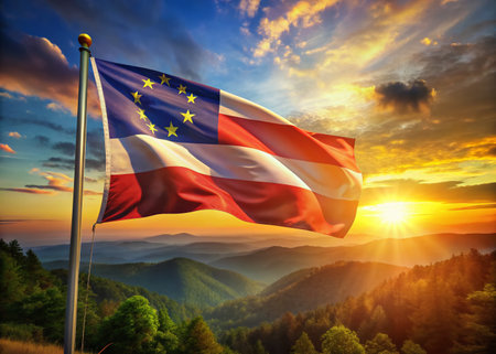 Georgia State Flag Waving in Scenic Landscape at Sunset - Stock Photo