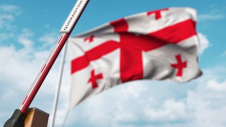 Opening boom barrier with QUARANTINE sign against the Georgian flag. Lockdown end in Georgia. 3D rendering