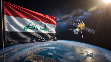 The flag of Iraq waves in the wind against a bright sky, displaying its red, white, and black horizontal stripes with green Arabic script.